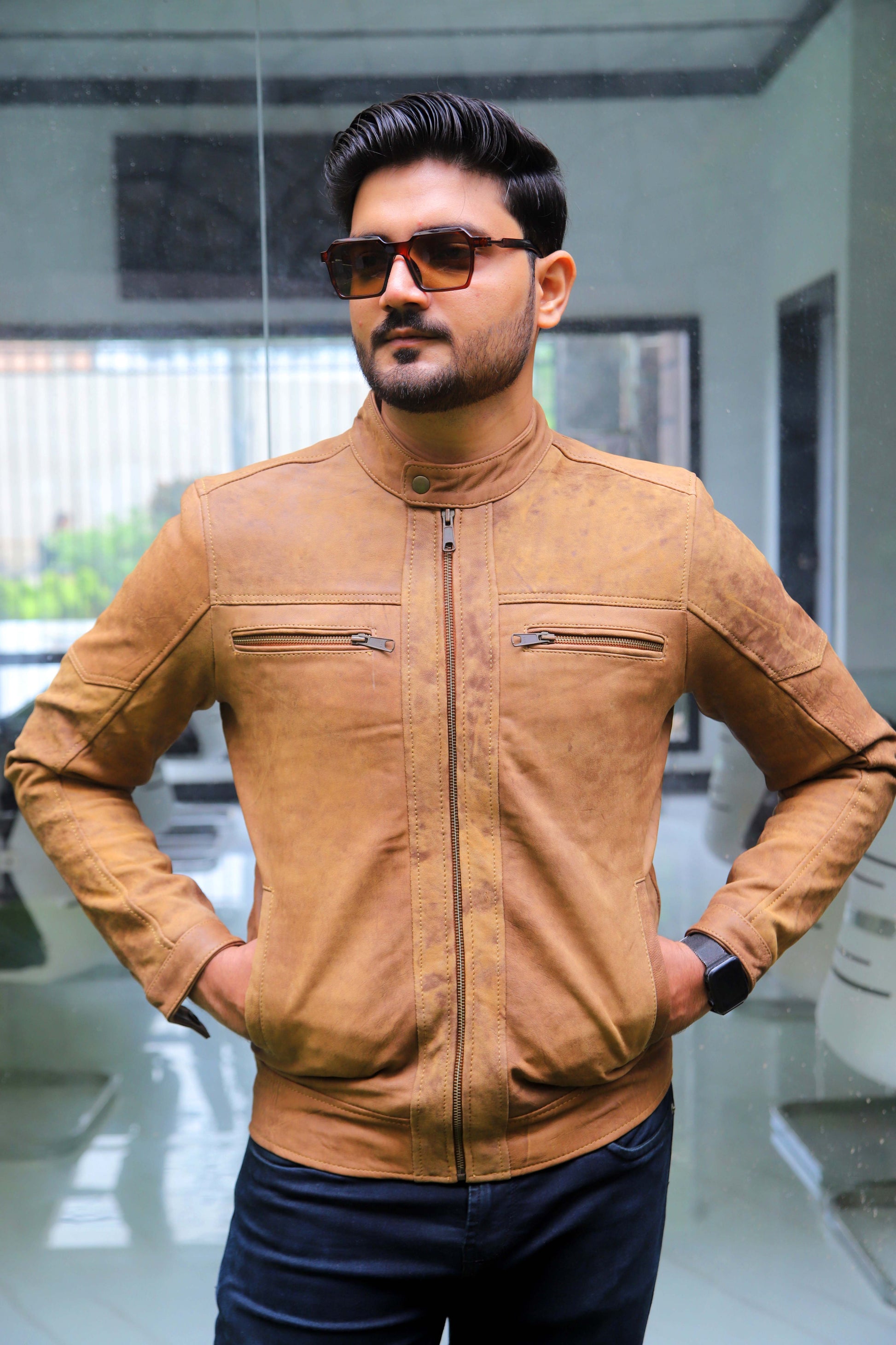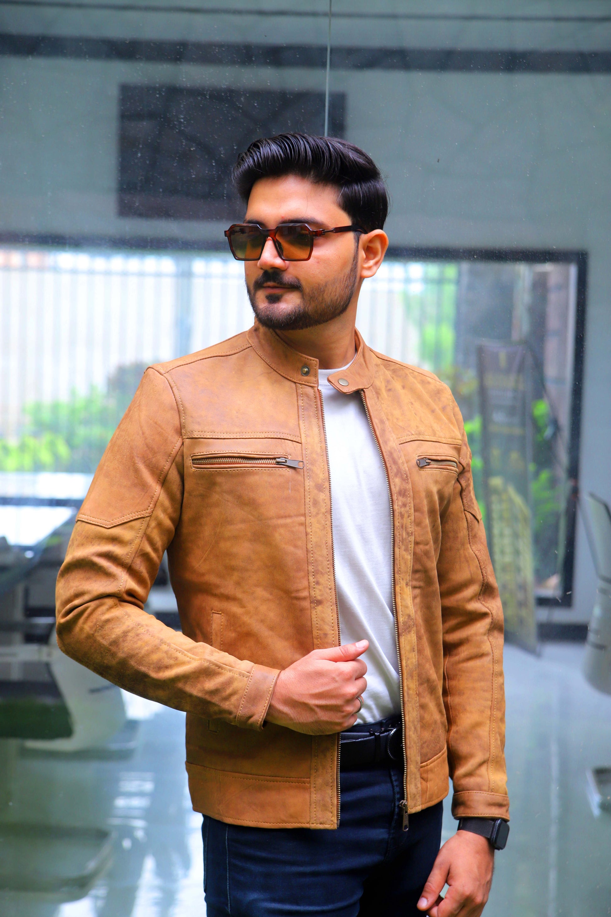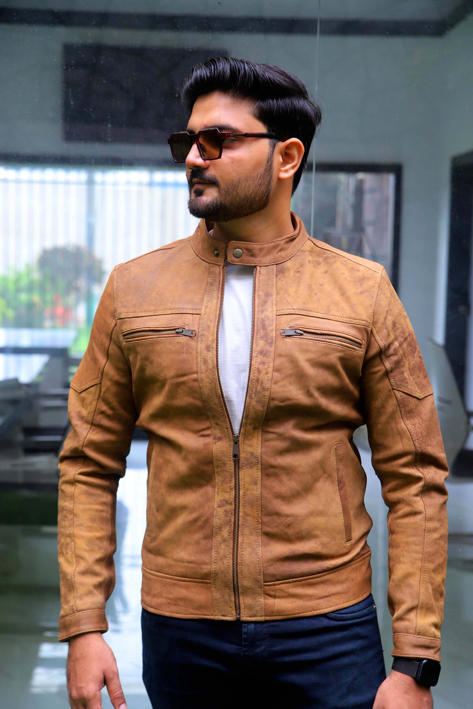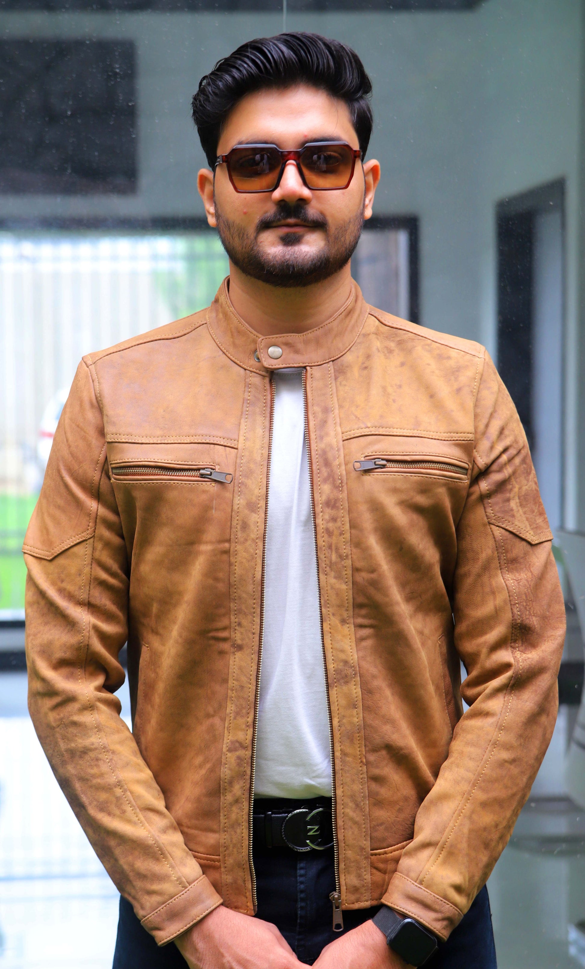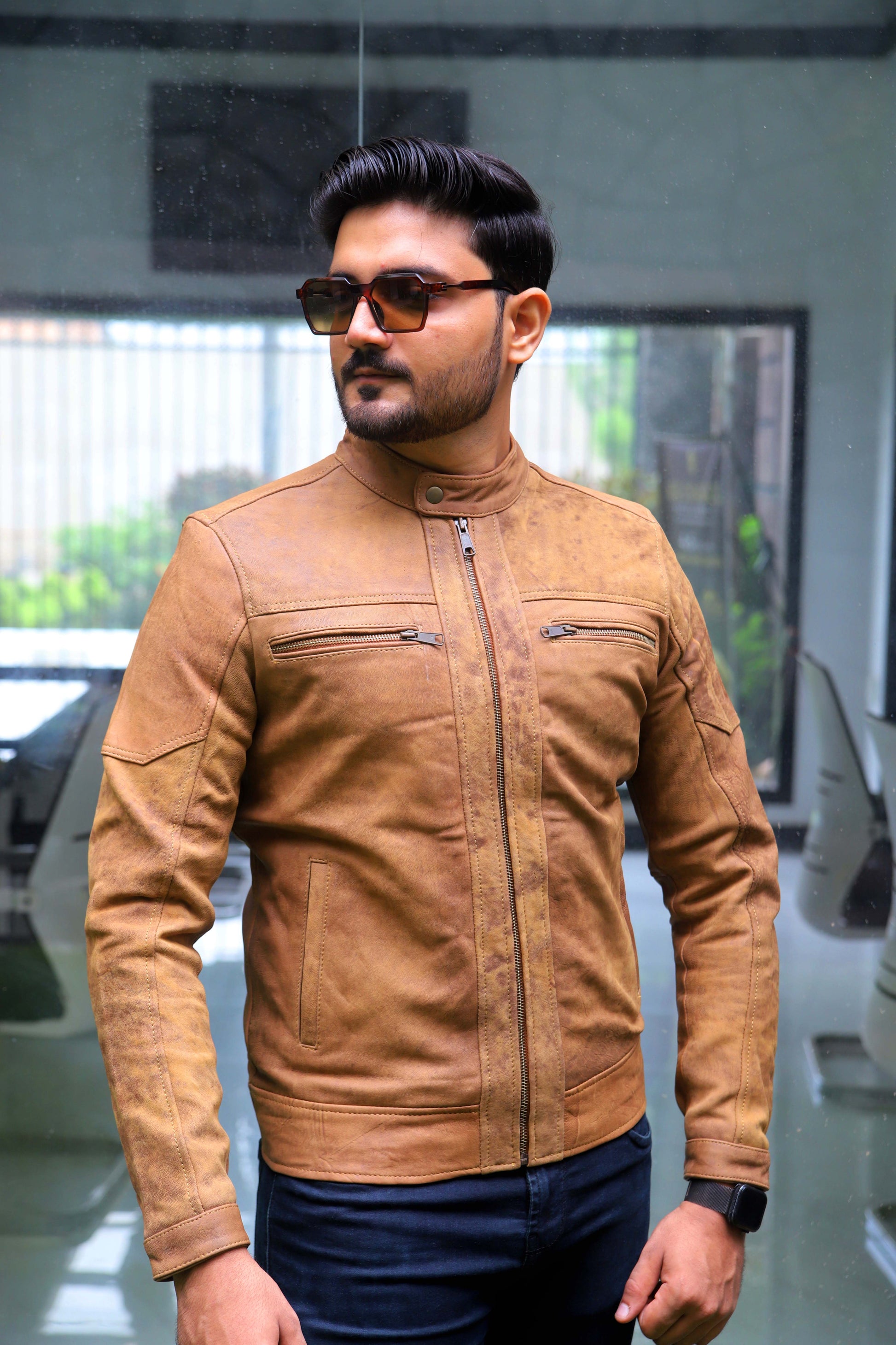 JHANG JACKET Men's Leather Jacket Suede Touch Men's Biker Leather Jacket, Casual Biker Street wear- Tan