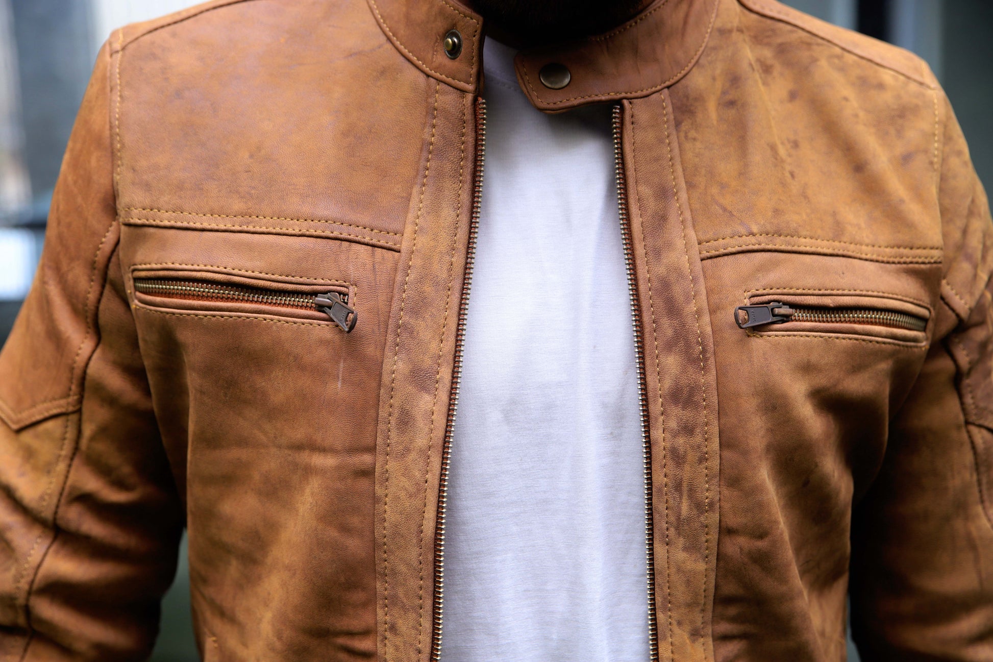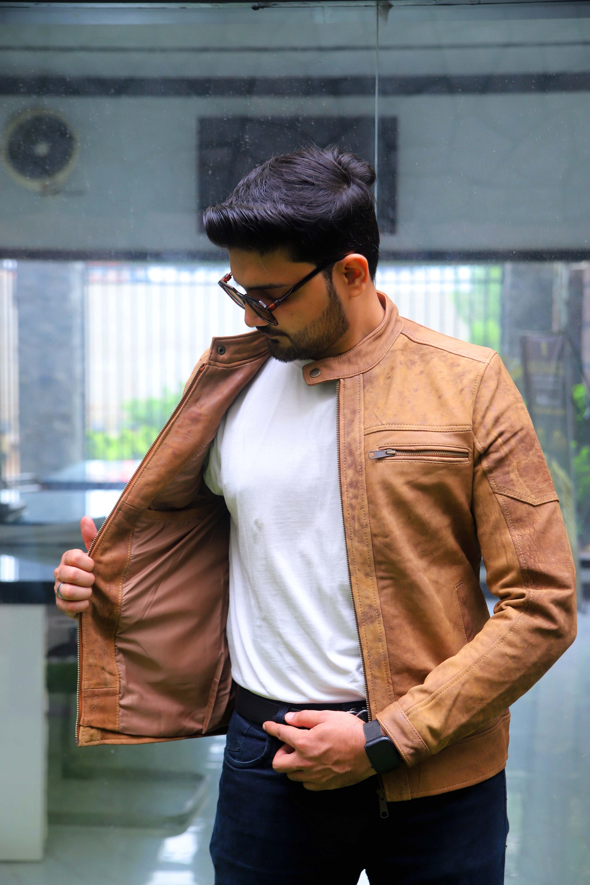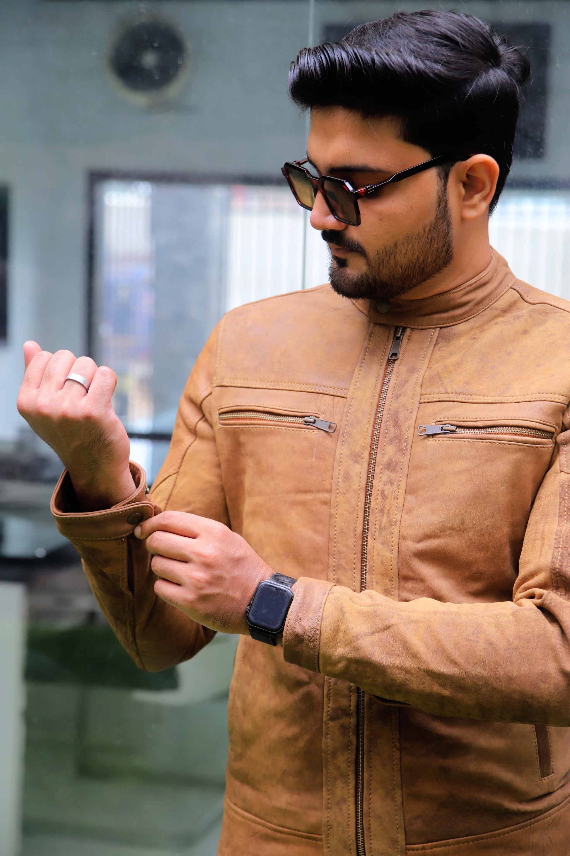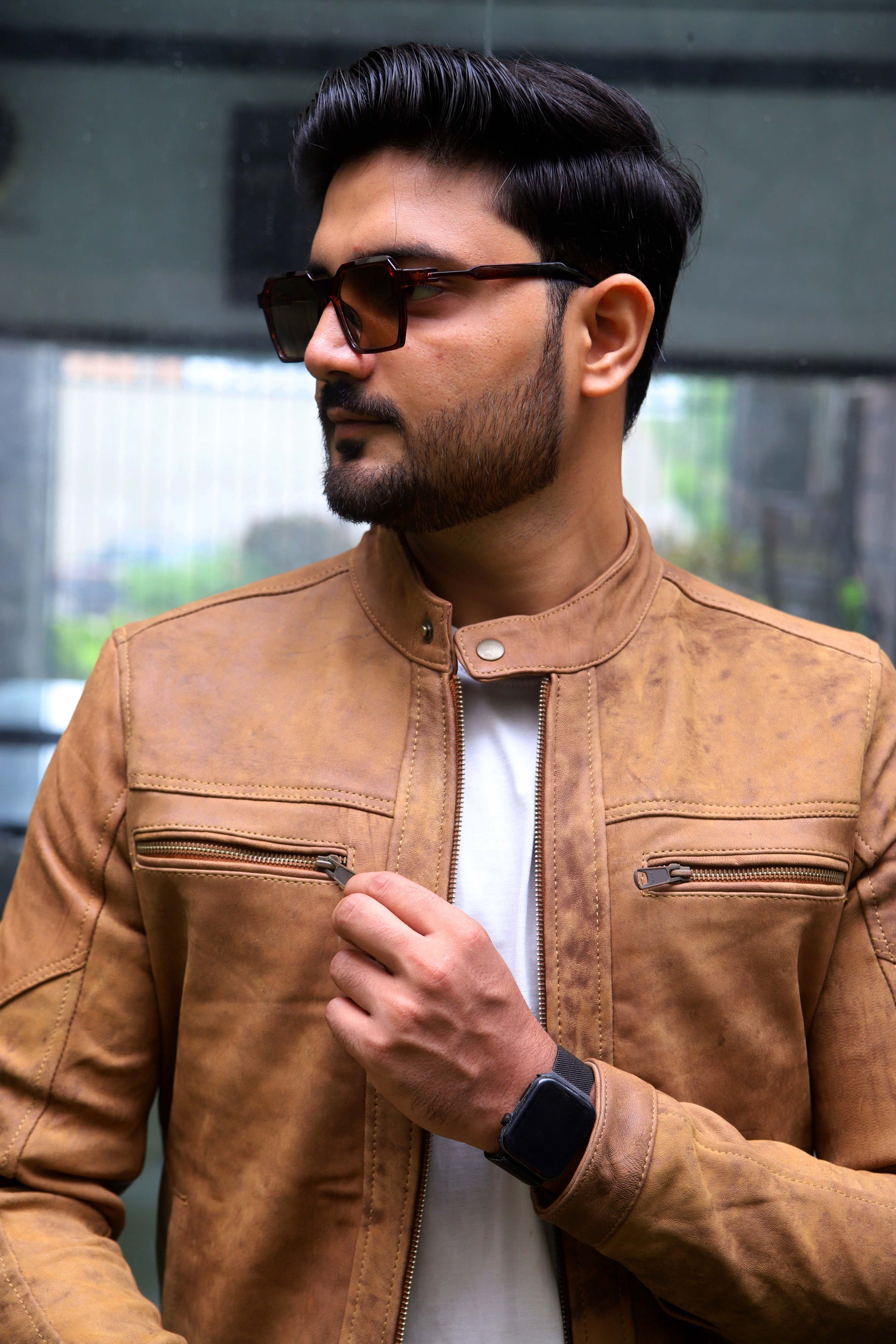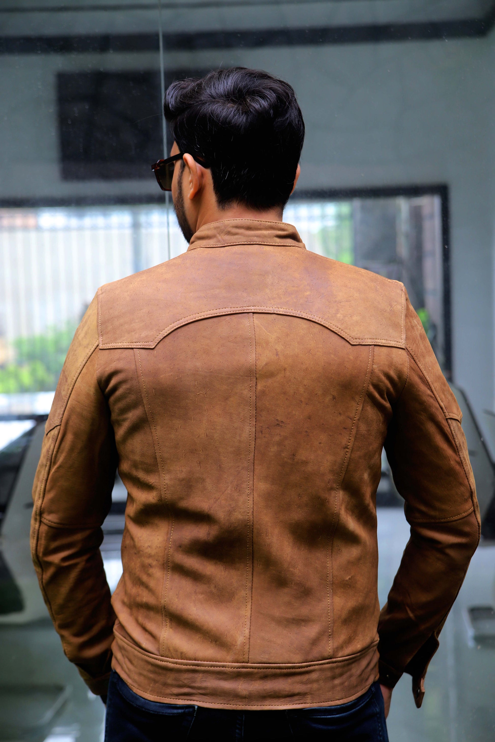 JHANG JACKET Men's Leather Jacket Suede Touch Men's Biker Leather Jacket, Casual Biker Street wear- Tan