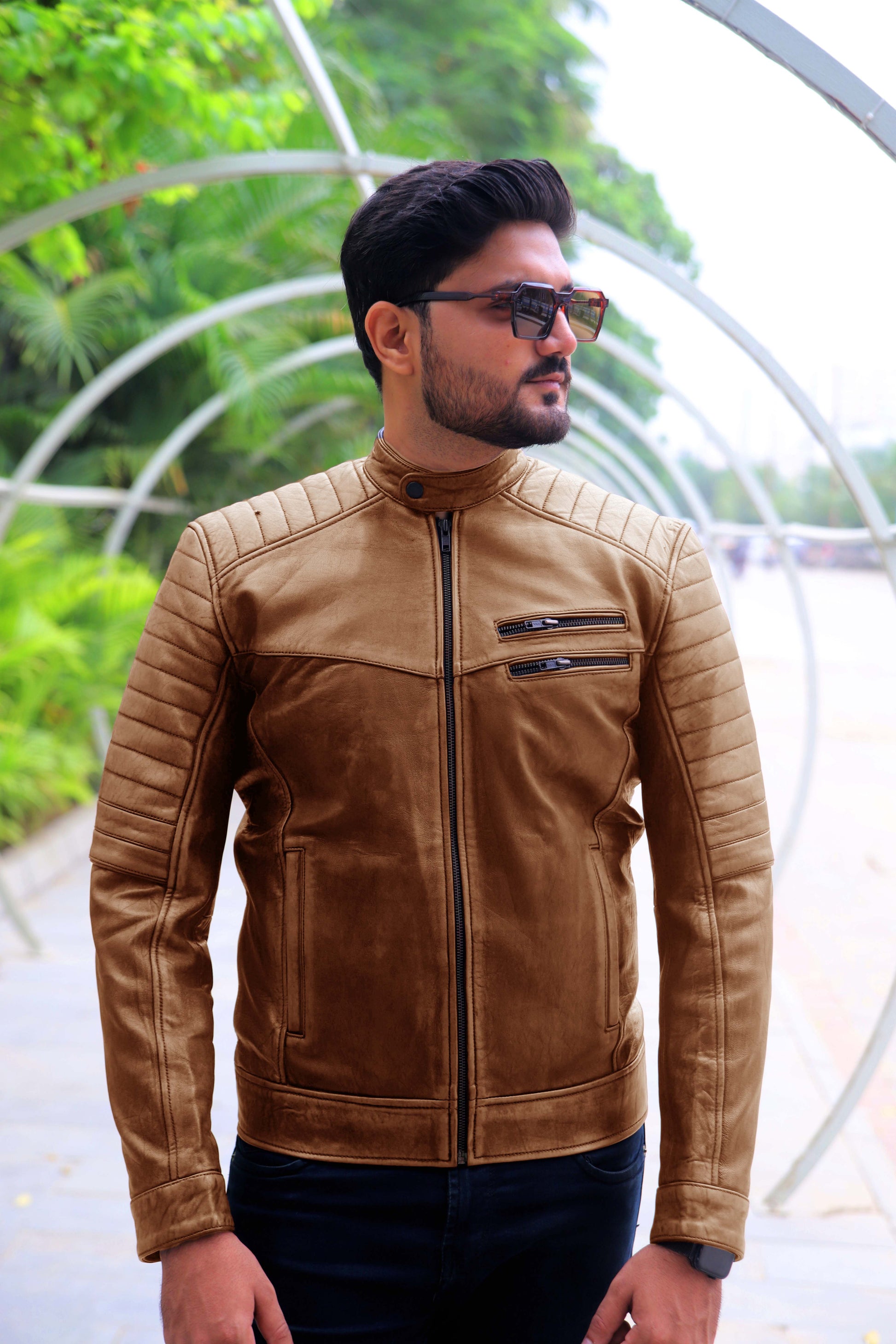 KAMOKE JACKET Men's Distressed Biker Leather Jacket, Vintage Motorcycle Jacket For Men- Vintage Cognac Lite