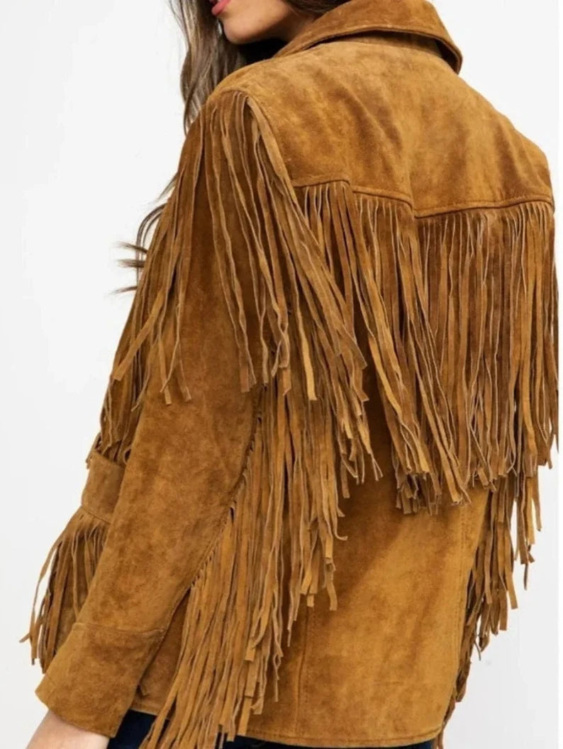 The fringe detailing across the chest, back, and sleeves adds a bold and eye-catching touch, making it the perfect statement piece for casual outings, festivals, rodeo events, or everyday wear. With its soft suede texture, it provides a luxurious feel while keeping you cozy in every season.