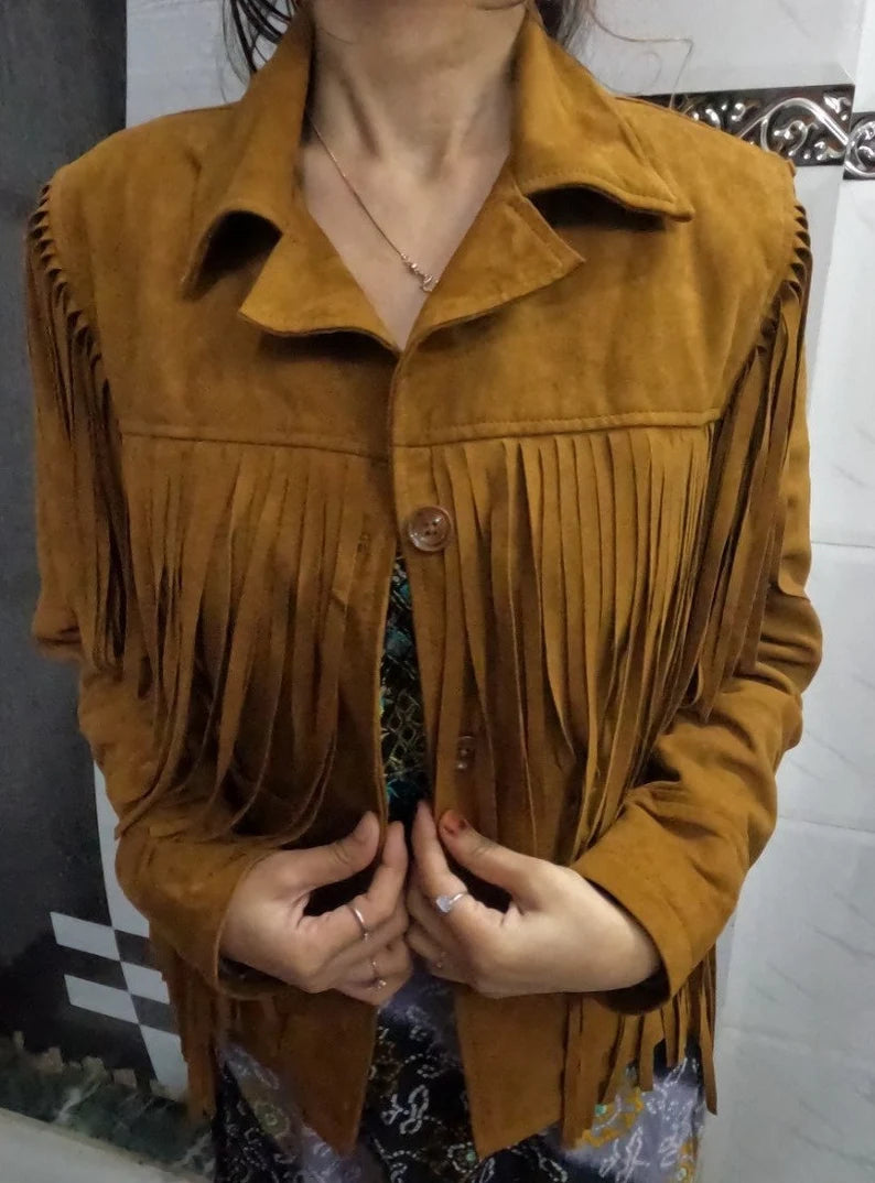 Bring out your inner cowgirl and turn heads with this stunning suede fringe jacket – a must-have piece in every woman’s wardrobe.