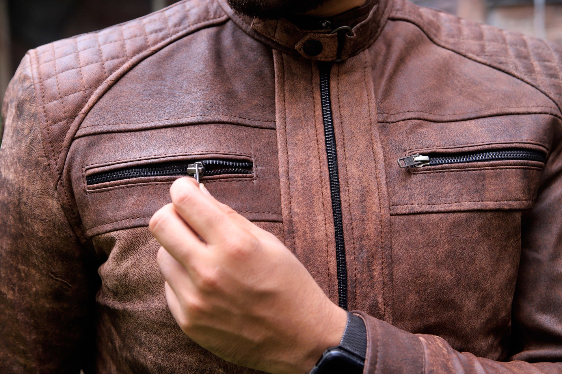 With its classic biker style, zipper closure, and smart fit, this jacket not only adds edge to your wardrobe but also offers protection while riding. The stylish lapel collar, quilted shoulders, and multiple zippered pockets give it a modern yet masculine look, making it ideal for bikers, casual wear, and winter fashion.