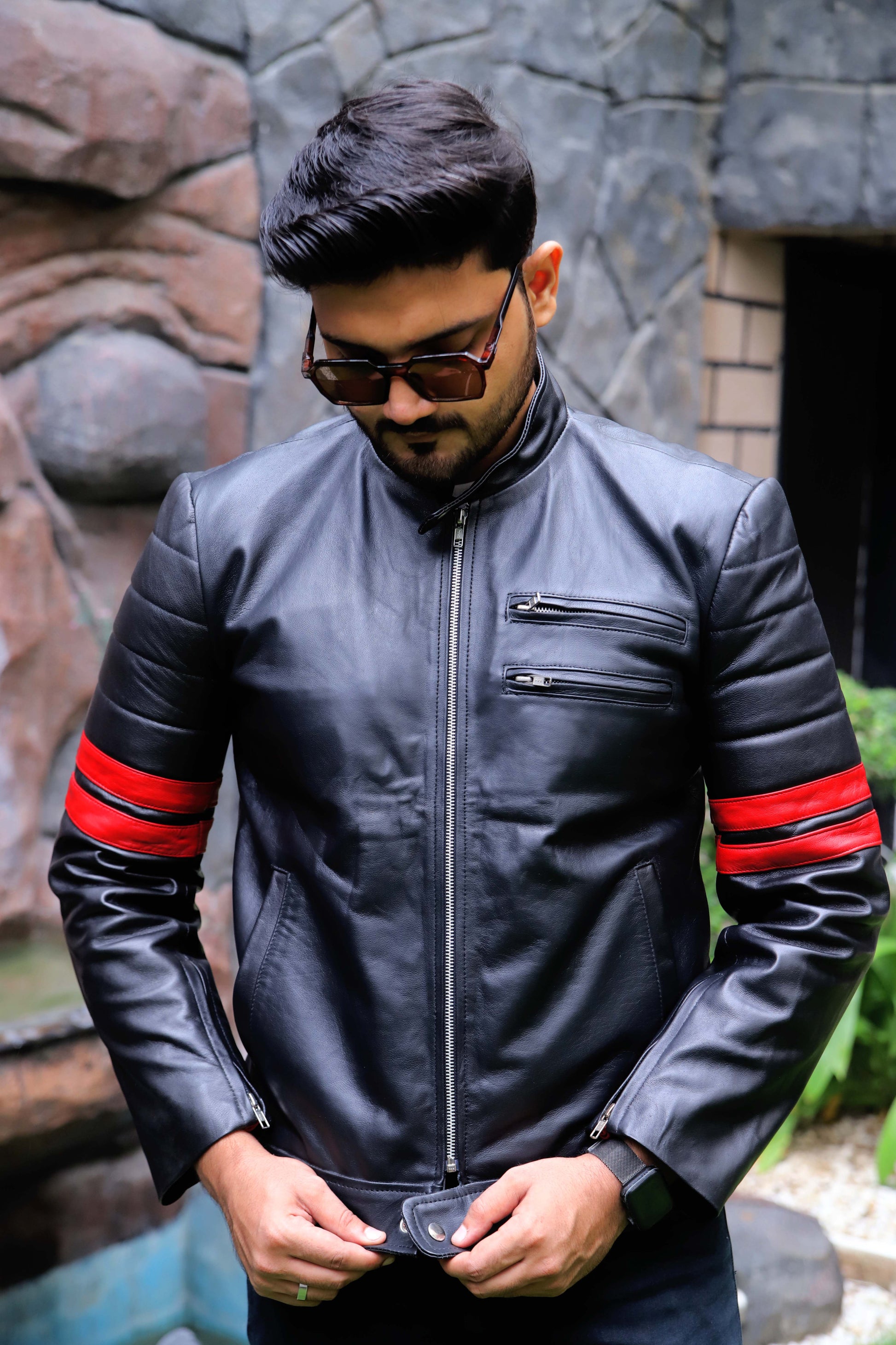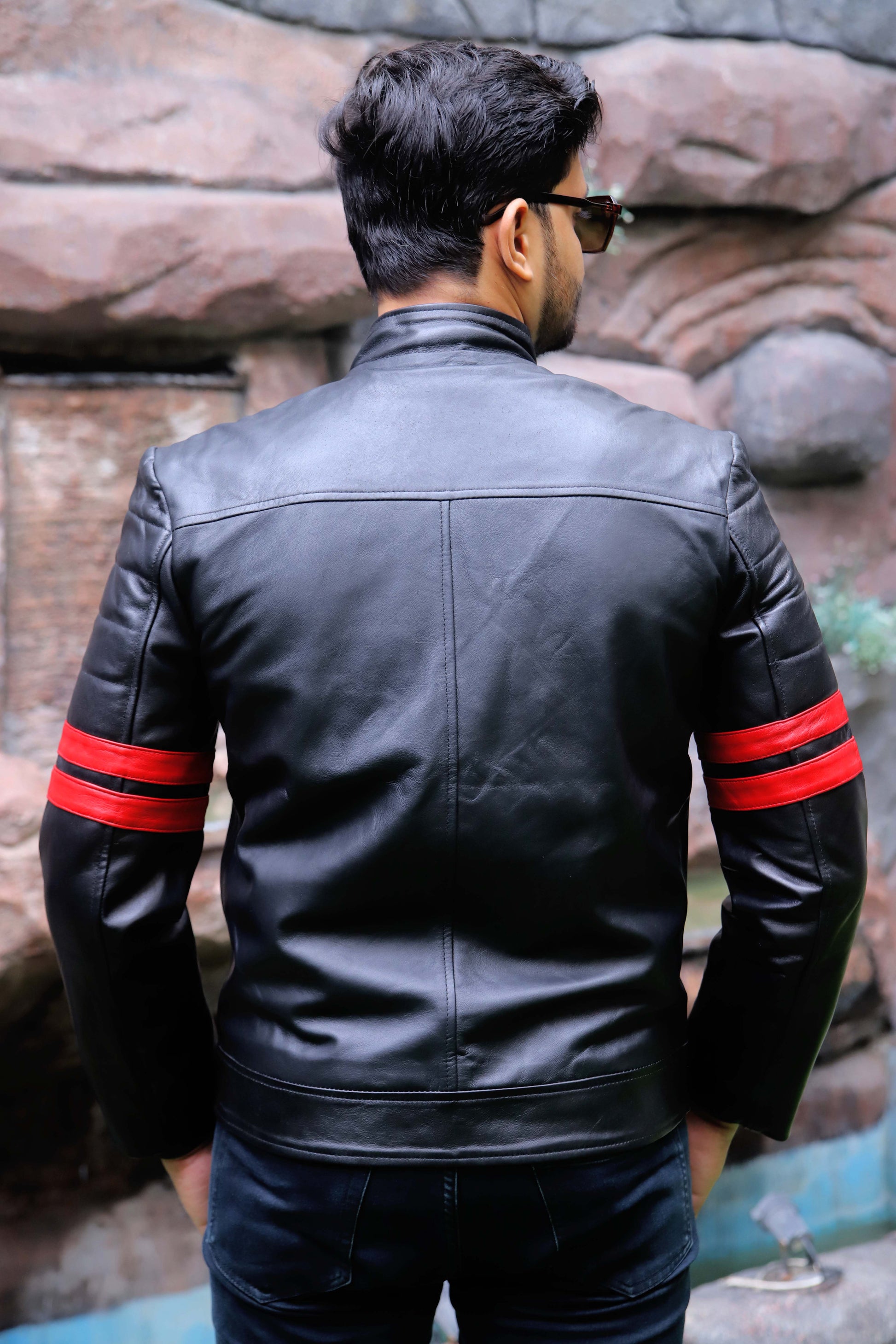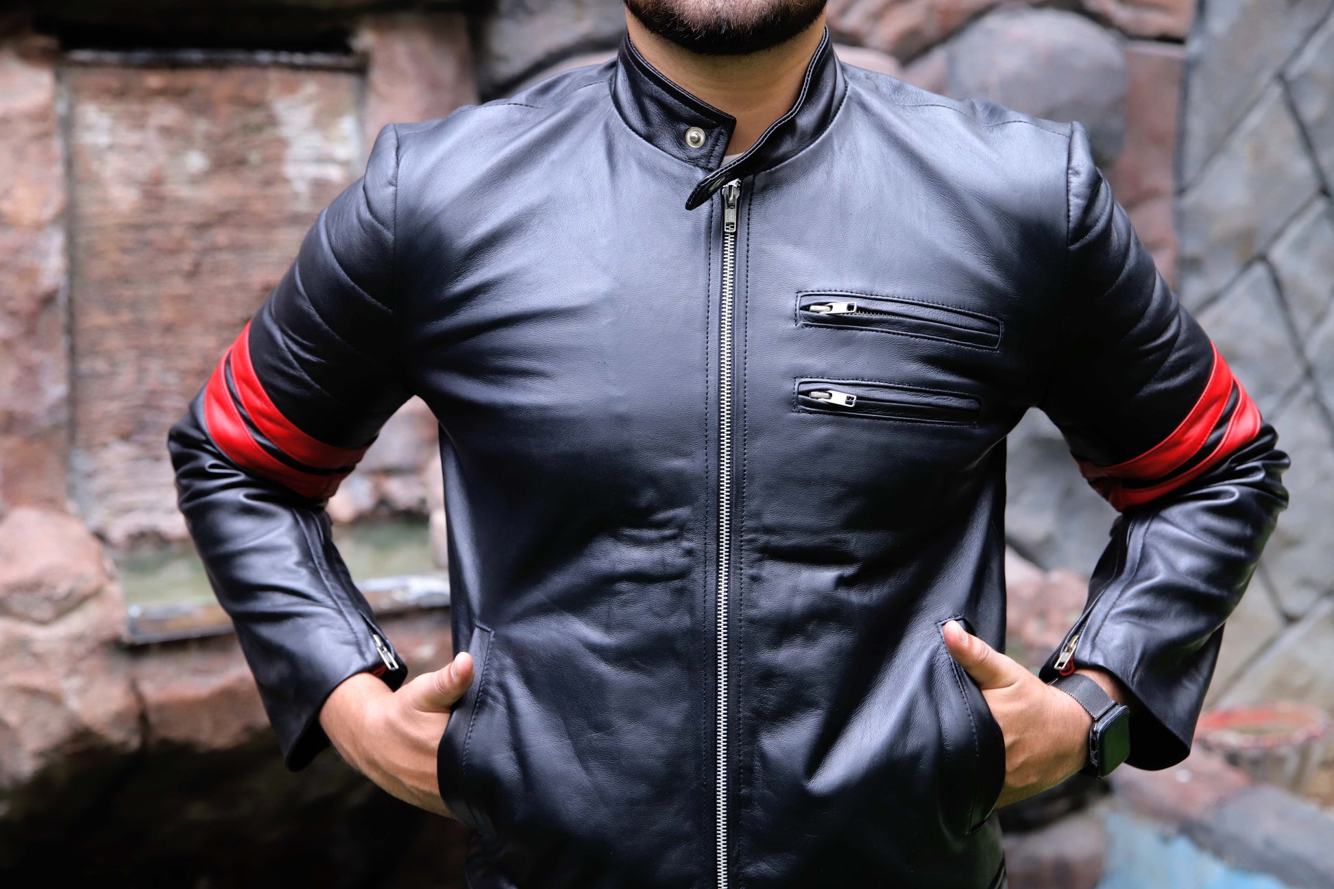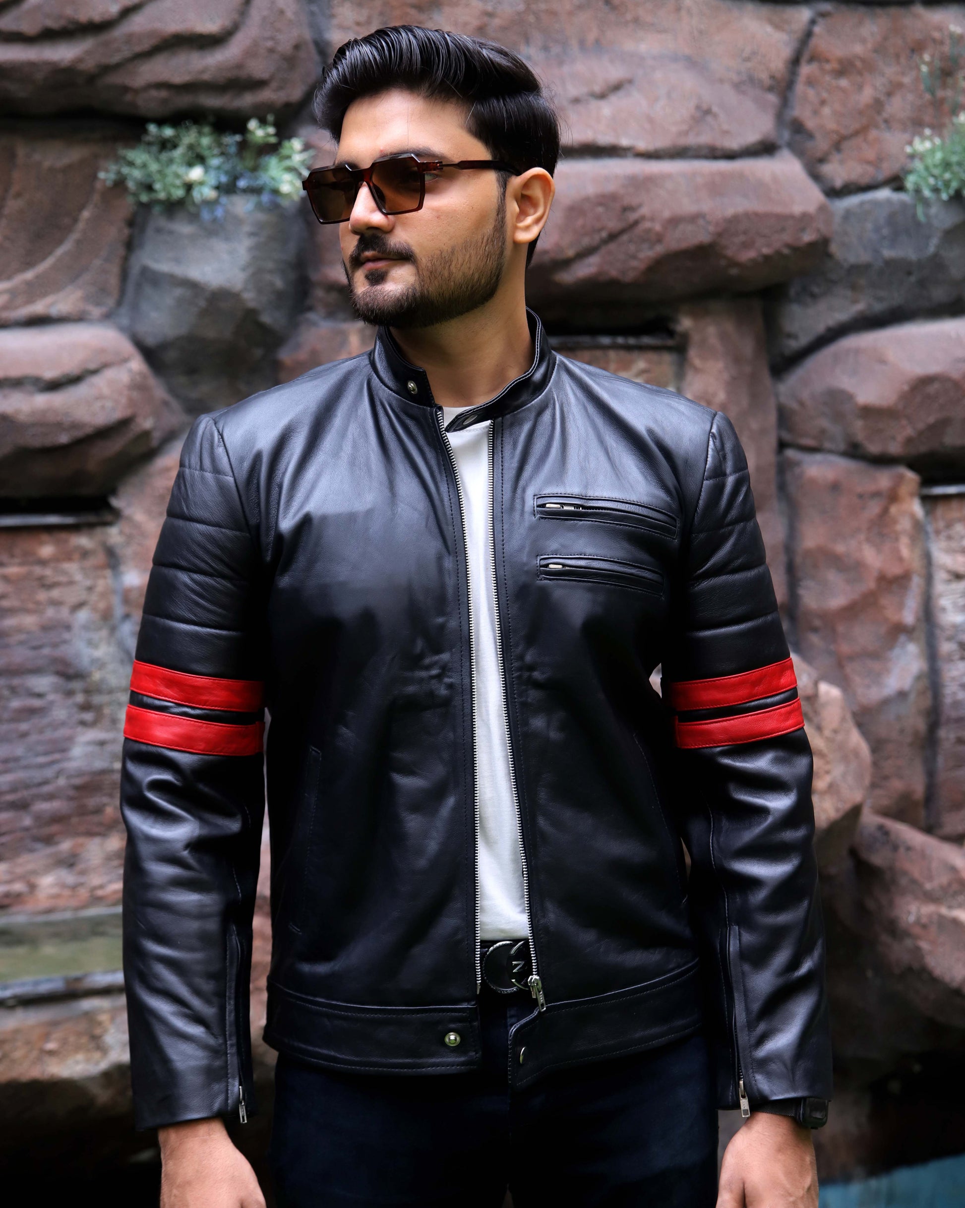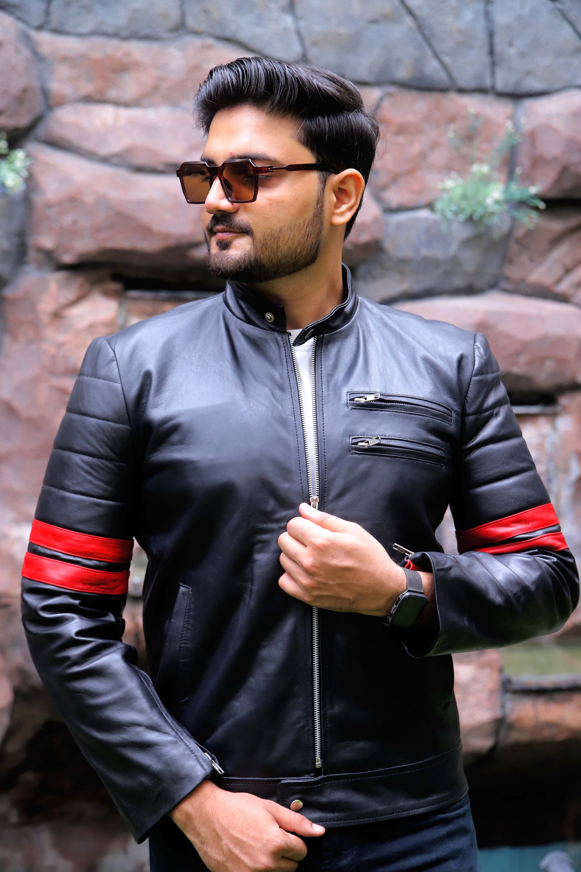 SARGODHA JACKET Men's Cafe Racer Leather Jacket With Red Bicep Stripes, Biker Leather Jacket For Men- Black/Red