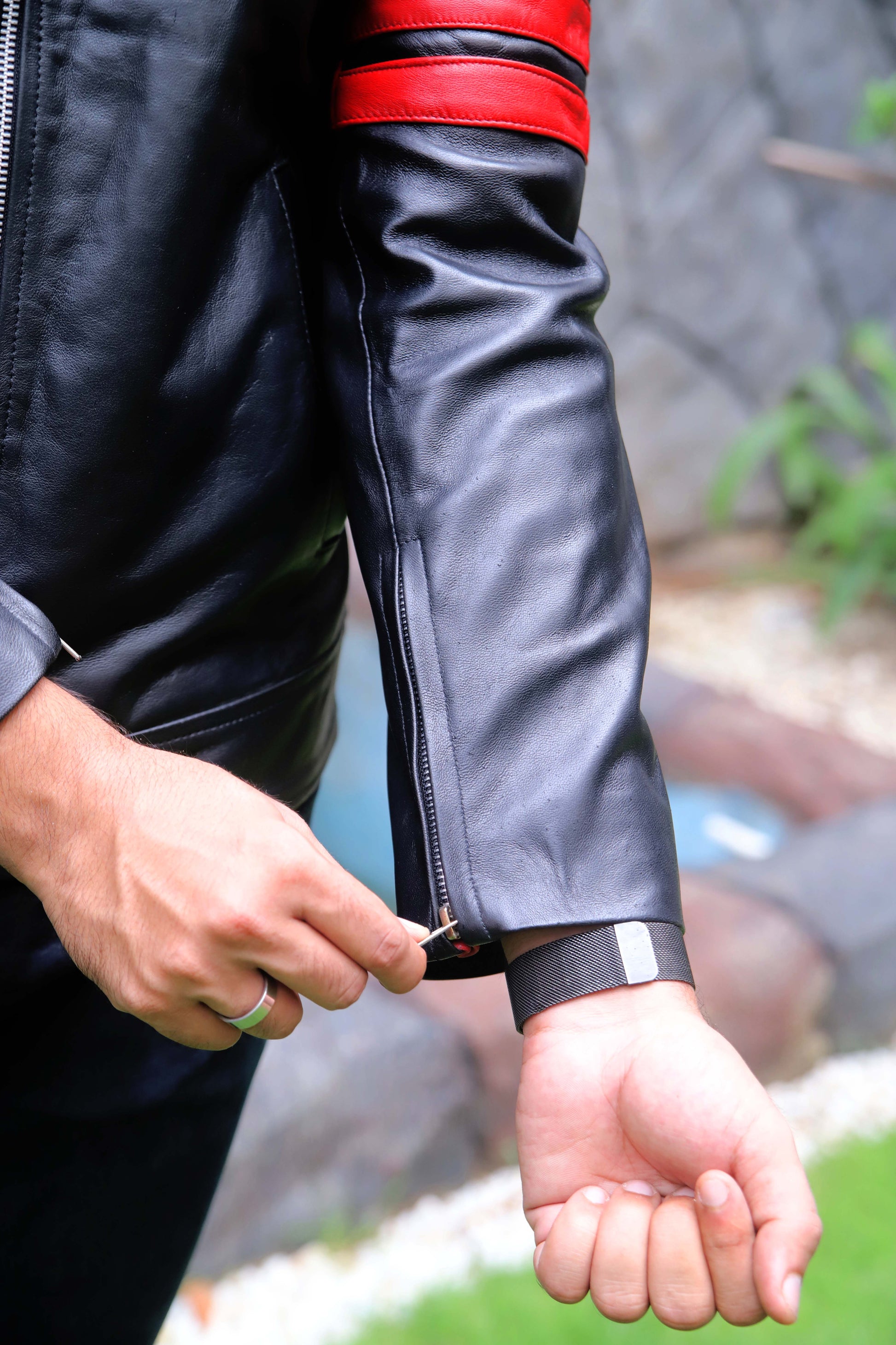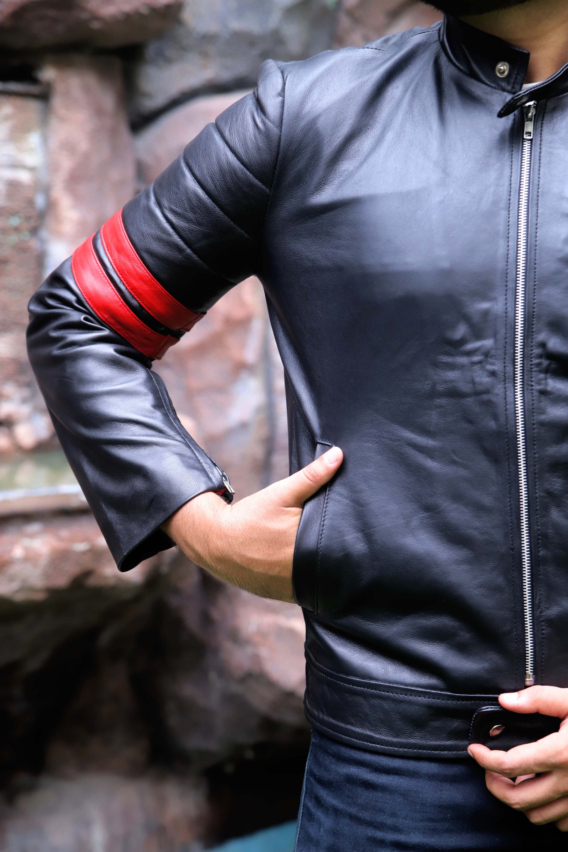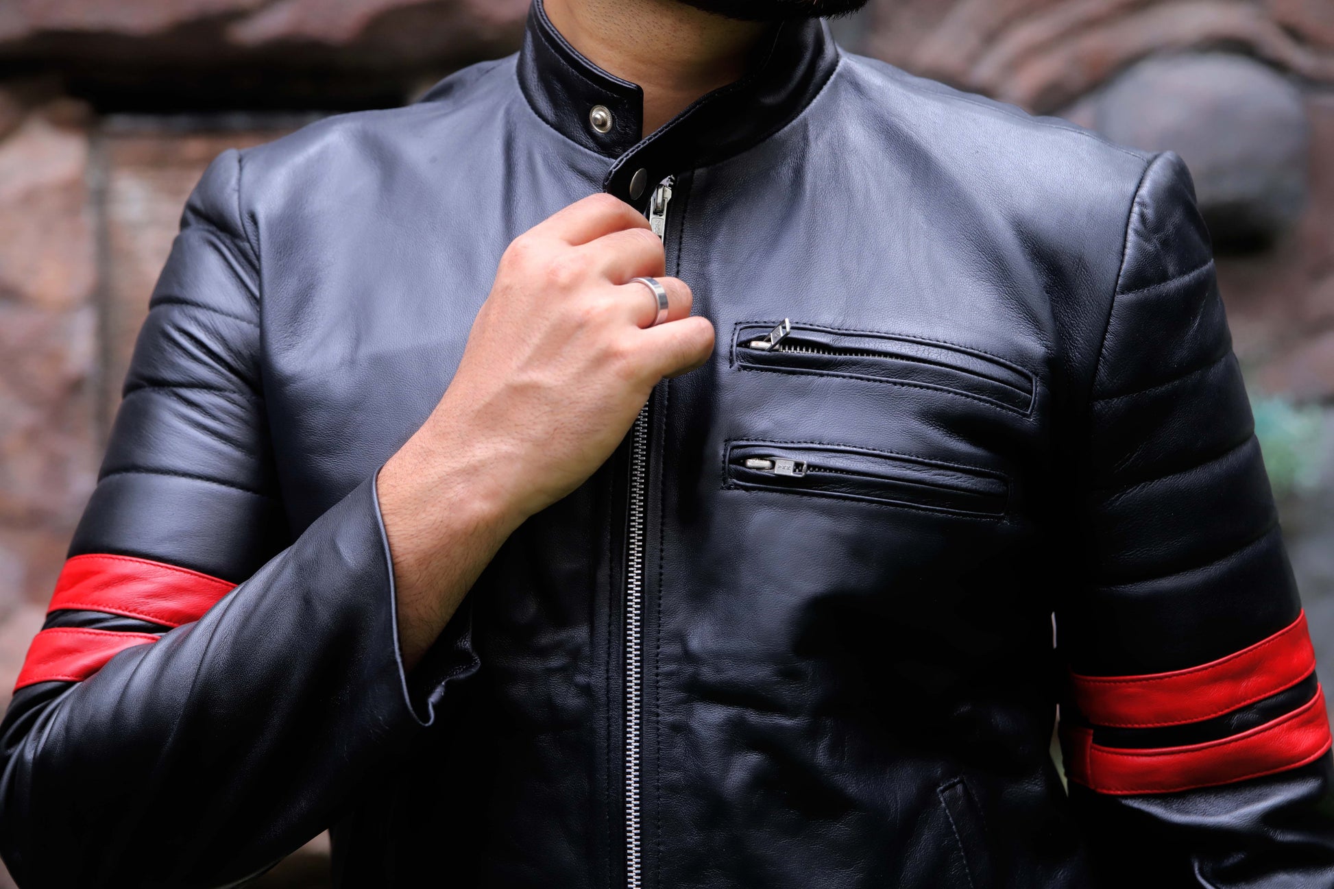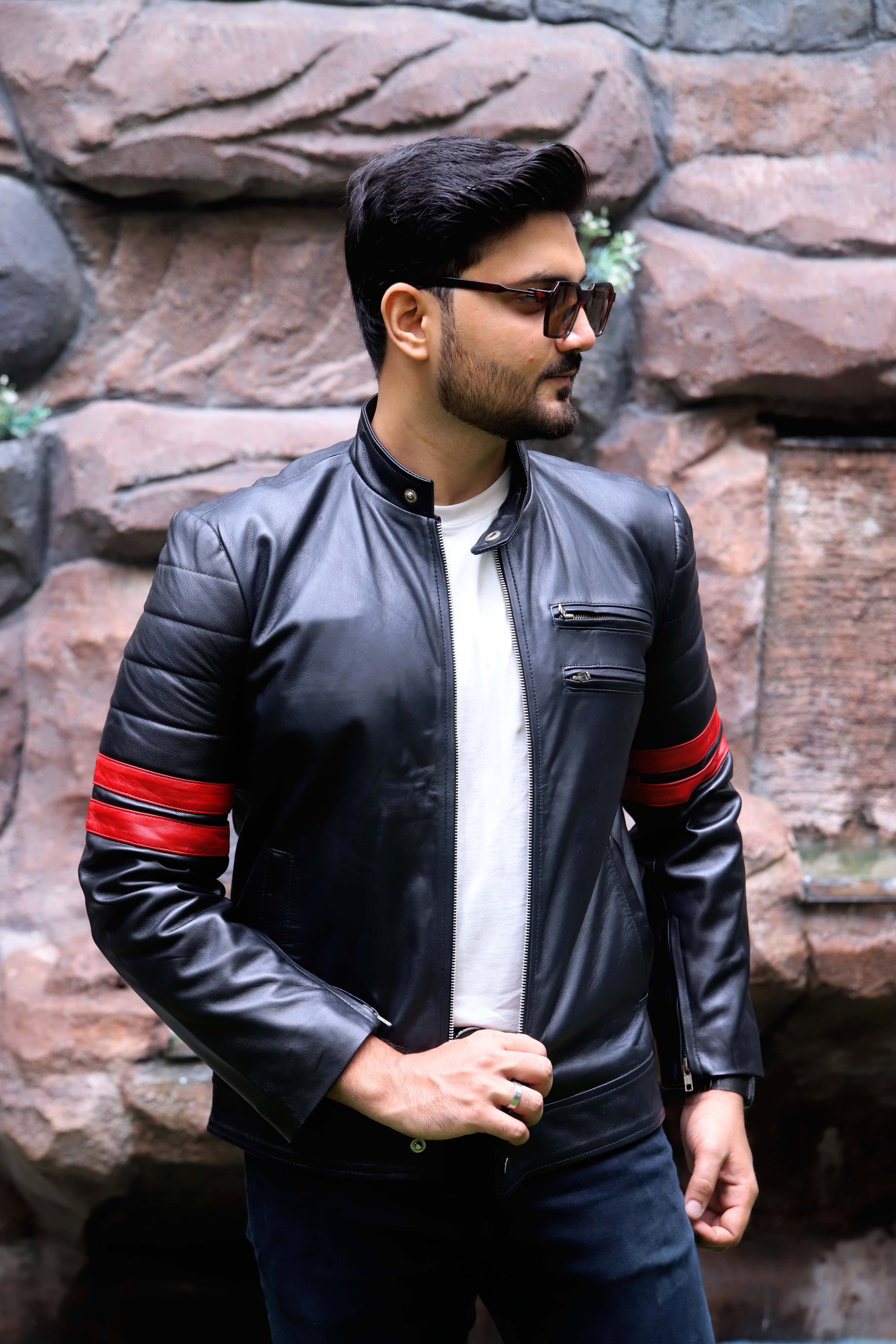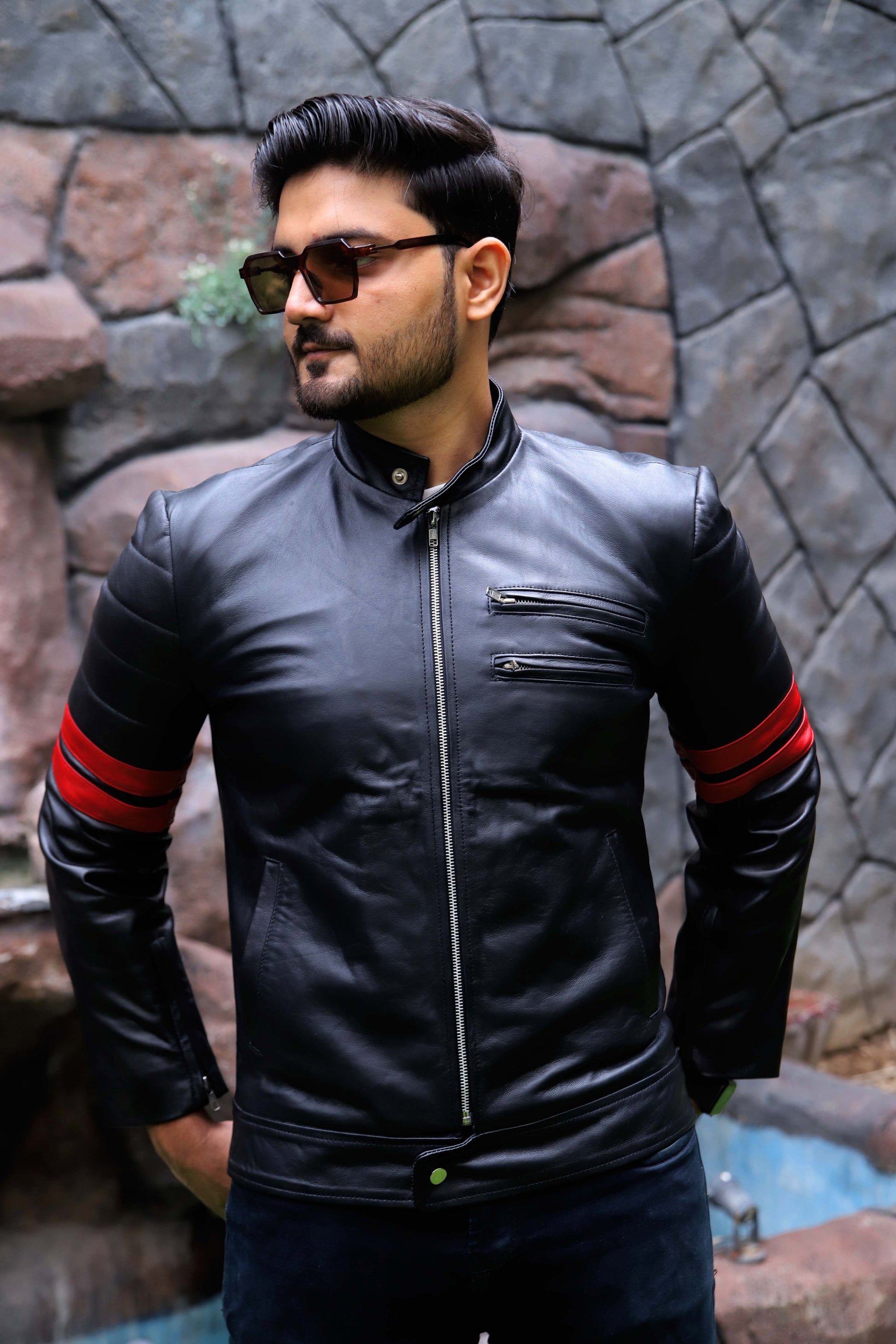 SARGODHA JACKET Men's Cafe Racer Leather Jacket With Red Bicep Stripes, Biker Leather Jacket For Men- Black/Red