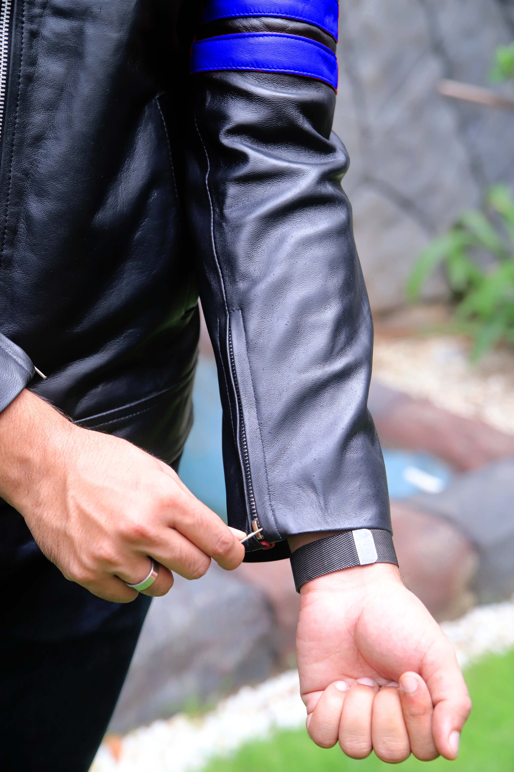 SARGODHA JACKET Men's Cafe Racer Leather Jacket With Blue Bicep Stripes, Biker Leather Jacket For Men- Black/Blue